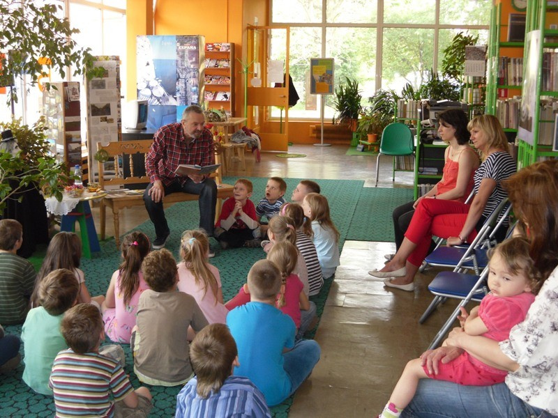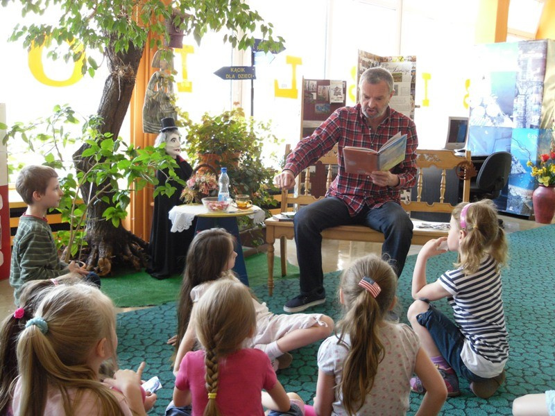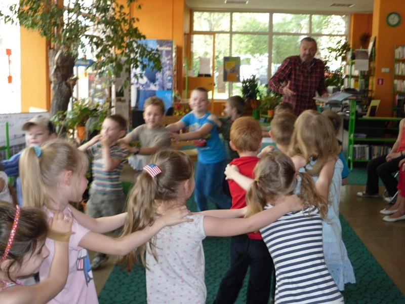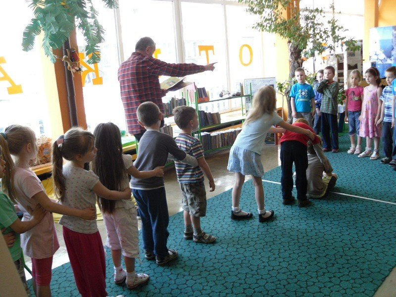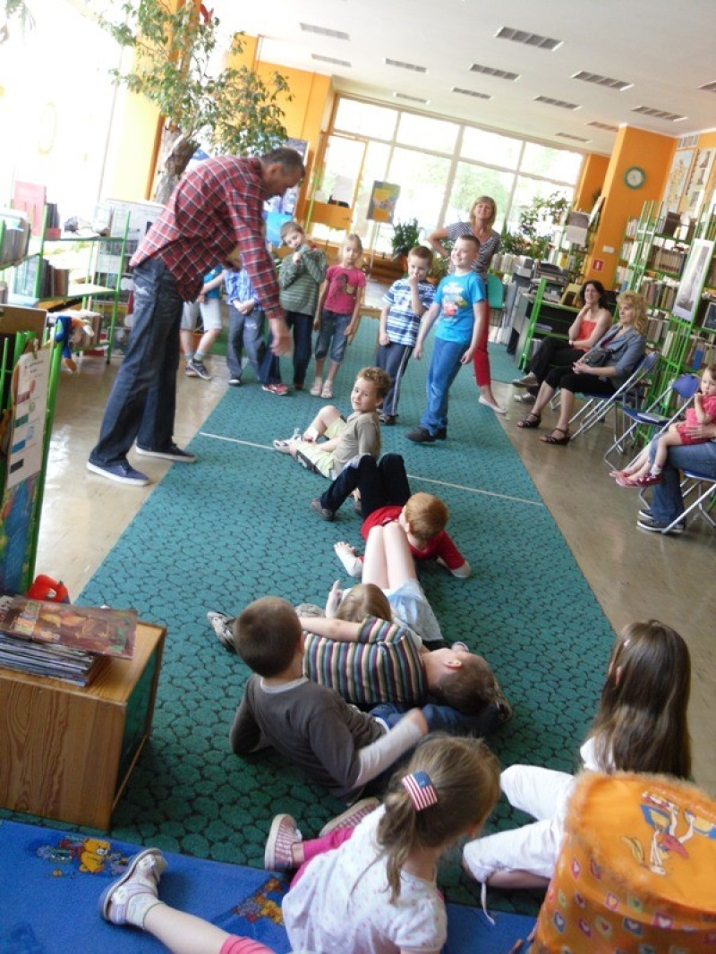 10 maja 2013 r., w Tygodniu, który w sposób szczególny promuje Biblioteki, dzieci z PM nr 83 (ul. Zbiorcza 3) spotkały się z aktorem Panem Włodzimierzem Adamskim w naszej placówce. To było wyjątkowe wydarzenie, podczas, którego wiele się działo . „Idzie, idzie bajka w świat… - to cykl trzech imprez, które miały na celu przybliżyć twórczość Juliana Tuwima. W sposób profesjonalny, a wielce sympatyczny Pan Włodzimierz zaprosił przedszkolaki w podróż Tuwimowską Lokomotywą, zatrzymując się na stacji ogród, gdzie poprowadził drużynę dziadka ku opornej Rzepce, by na koniec wyprawy prawie zerwać podłogę w bibliotece w poszukiwaniu zaginionych Okularów, które jak się okazało były na szacownym aktorskim nosie. Ponieważ maluchom wydawało się, że na temat wierszy Juliana Tuwima wiedzą wszystko , nasz Gość przeprowadził quiz, który to, co tu ukrywać… okazał się wielką porażką prowadzącego i organizatorów. Uśmiechnięte dzieciaki odpowiadały perfekcyjnie i nie pozostawiły w tym zakresie żadnej wątpliwości – są najlepsze. Jakby tego było jeszcze mało, rzuciły aktorowi rękawicę, w zakresie występów scenicznych. Przedszkolaki i na tym polu , odniosły ogromny sukces, owe biblioteczne kalambury wykazały, iż nadchodzą młodzi, utalentowani adepci scenicznych doznań. Pozostało nam jedynie docenić występy wielkim brawami, rozdać słodkie nagrody, poczęstować zakładami i naklejkami.