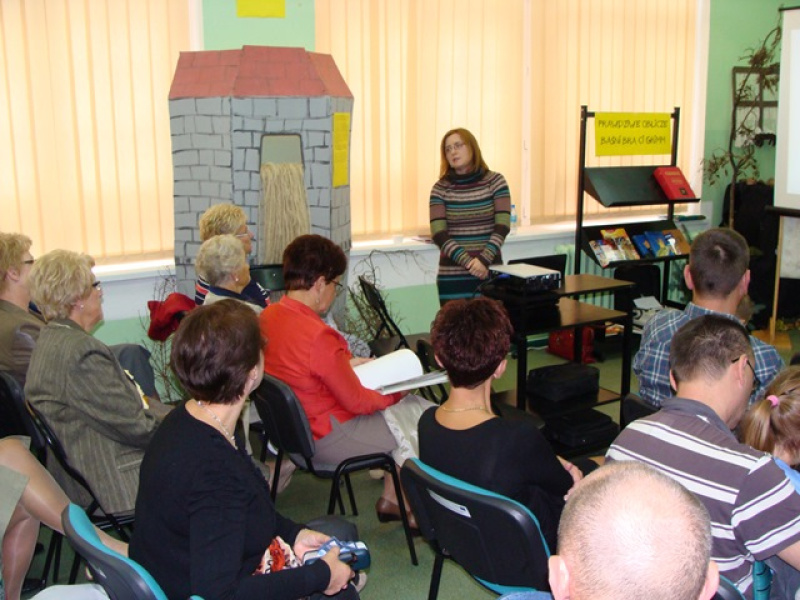 Następnie głos zabrała autorka przekładu „Baśni dla dzieci i dla domu” prof. UAM dr hab. Eliza Pieciul-Karmińska. Wśród wszystkich ciekawostek, jakimi zabawiała zebranych prelegentka, pojawiło się też odniesienie do występu seniorów. Okazało się bowiem, że Czerwony Kapturek to dorastająca dziewczyna, a nie małe dziecko. Całe wystąpienie tłumaczki opierało się na konkretnych przykładach, a zaproszeni goście mieli okazję przejrzeć różnorakie wydania baśni Grimmów, przywiezione przez panią profesor.