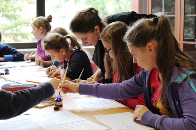 Warsztaty poprowadziła Aleksandra Zajdel, artystka, studentka Wydziału Form Przemysłowych ASP w Krakowie, związaną w Klubem Inicjatyw Artystycznych „WSCHÓD”. W trakcie trzech spotkań uczniowie SP nr 1, nr 2, nr 4 i nr 12 w Jaśle, oraz Zespołu Szkół w Umieszczu i Zespołu Szkół w Warzycach, wyposażeni w stalówki mocowane na drewnianych obsadkach i kałamarze, poznawali sztukę pisania liter pięknie wykrojonych, proporcjonalnych, ozdobnych. Pisanie piórem i atramentem okazało się niełatwą, wymagającą skupienia, ale niezwykle wciągającą zabawą, której efektem są piękne kaligramy oraz ozdobne inicjały. Umazani atramentem ale uśmiechnięci uczestnicy warsztatów podkreślali, że to na pewno nie koniec ich przygody z kaligrafią.