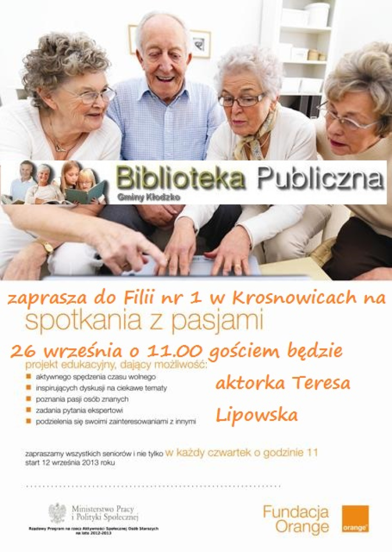 W każdy czwartek o godzinie 11.00 w bibliotekach na terenie całej Polski odbywają się niepowtarzalne „spotkania z pasjami” organizowane przez Fundację Orange. Seniorzy mają możliwość nawiązać wirtualną relację ze znanymi osobami życia publicznego aktorami, restauratorami, specjalistami z różnych dziedzin - dzięki nowoczesnym technologiom. W projekcie bierze udział również Biblioteka Publiczna Gminy Kłodzko.