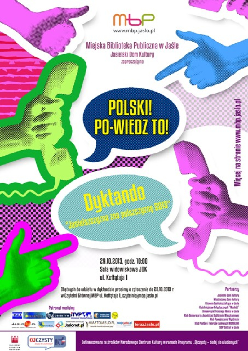 Miejska Biblioteka Publiczna w Jaśle zaprasza wszystkich odważnych miłośników polszczyzny do udziału w drugim dyktandzie „Jasielszczyzna zna polszczyznę”. Wydarzenie będzie okazją do sprawdzenia własnej wiedzy o języku ojczystym w pogodnej atmosferze i doborowym towarzystwie. Dyktando, którego autorką jest nauczyciel polonista Aleksandra Dacyl, odbędzie się 29 października 2013 r. o 10:00 w sali widowiskowej Jasielskiego Domu Kultury, partnera projektu.