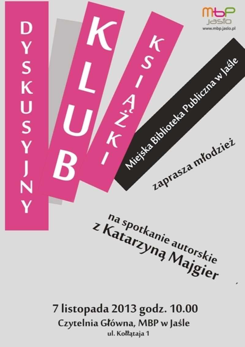 7 listopada 2013 r. Miejska Biblioteka Publiczna w Jaśle zaprasza młodych czytelników na spotkanie autorskie Katarzyną Majgier, które odbędzie się w ramach Dyskusyjnego Klubu Książki dla Młodzieży.