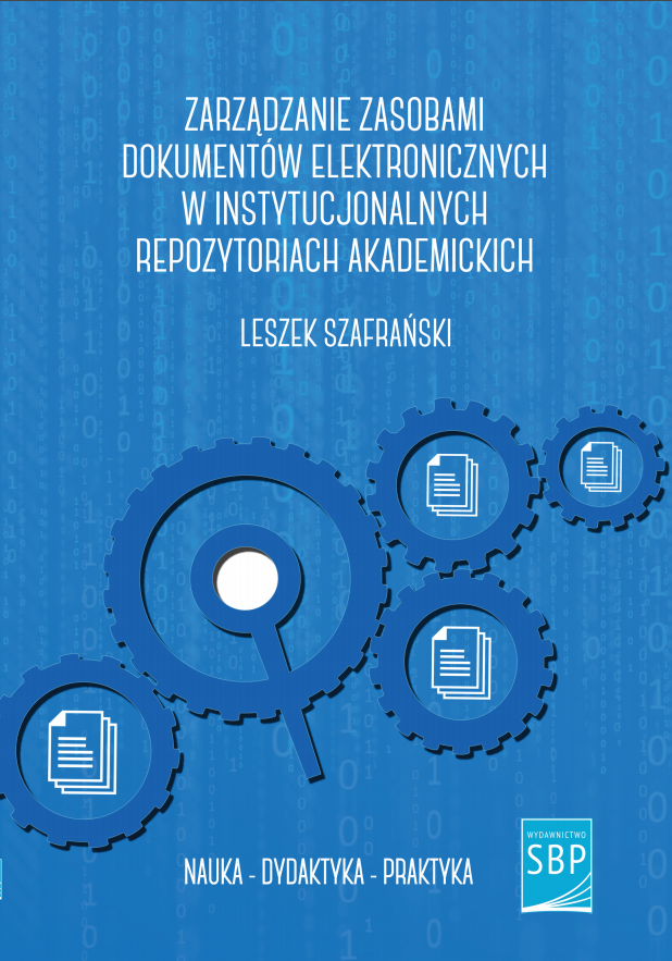 Leszek Szafrański Zarządzanie zasobami dokumentów elektronicznych w instytucjonalnych repozytoriach akademickich . Warszawa: Wydawnictwo Naukowe i Edukacyjne SBP, 2019, 184 s. (Nauka, Dydaktyka, Praktyka ; 188)